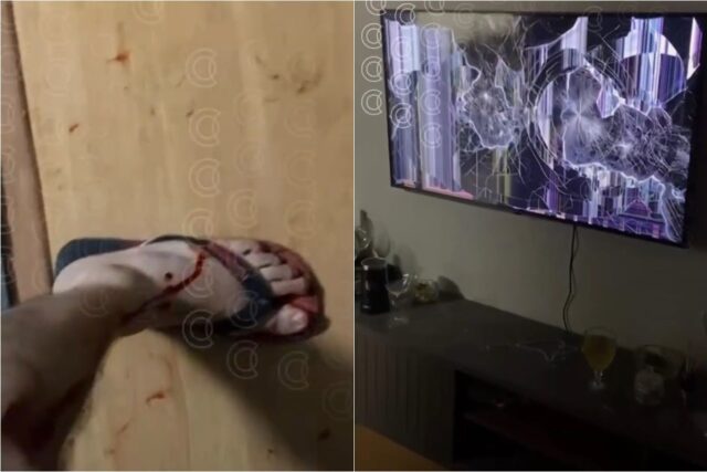 “Olha o que a fera fez, ó. Quebrou a televisão. Olha isso aqui, sangue. Quebrou uma taça em mim. Desnecessária uma coisa dessa. Olha aí, sangue no sofá. Olha aqui, quebrou a televisão”, disse.
