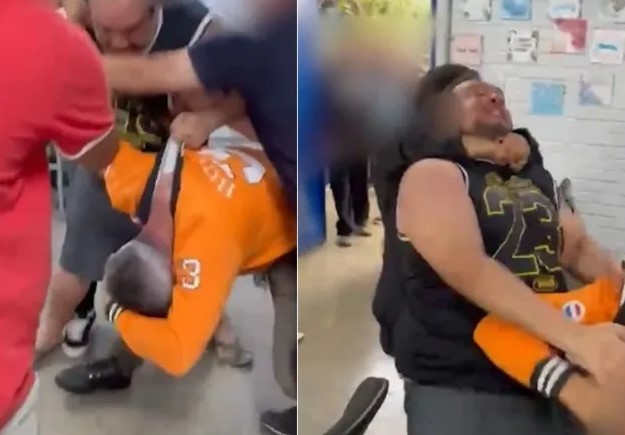 Câmeras de segurança registraram o momento em que o agressor, invade a sala de coordenação do centro educacional e atinge a cabeça do professor, que tenta se proteger enquanto funcionários intervêm.